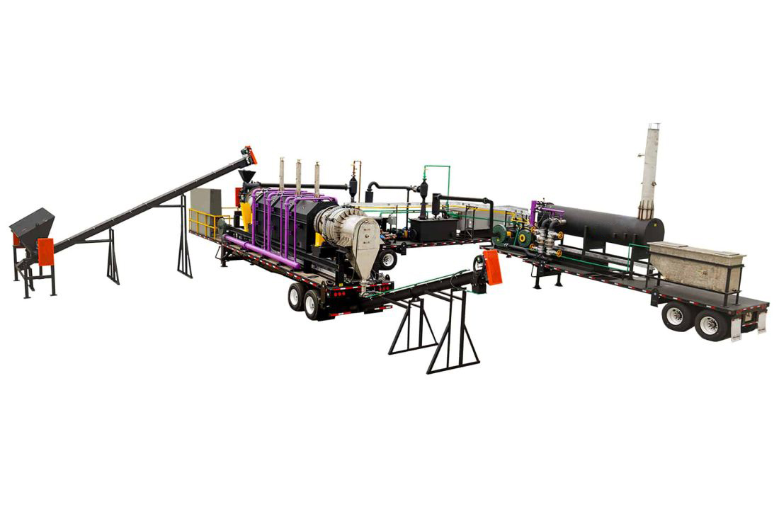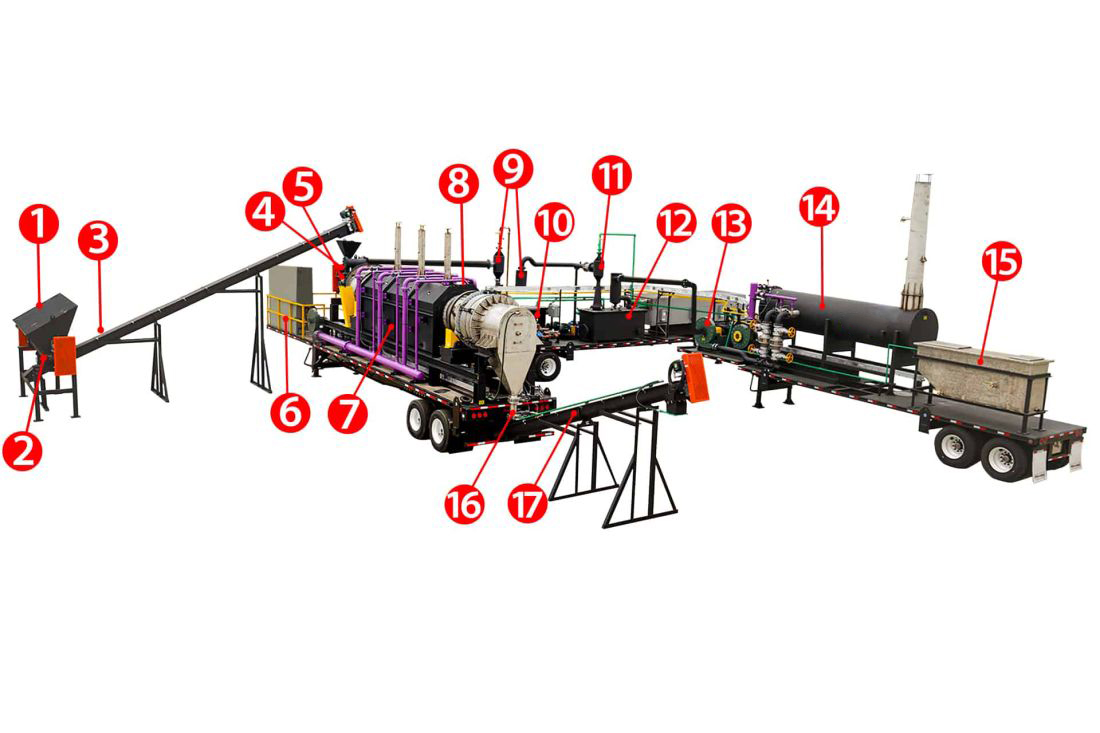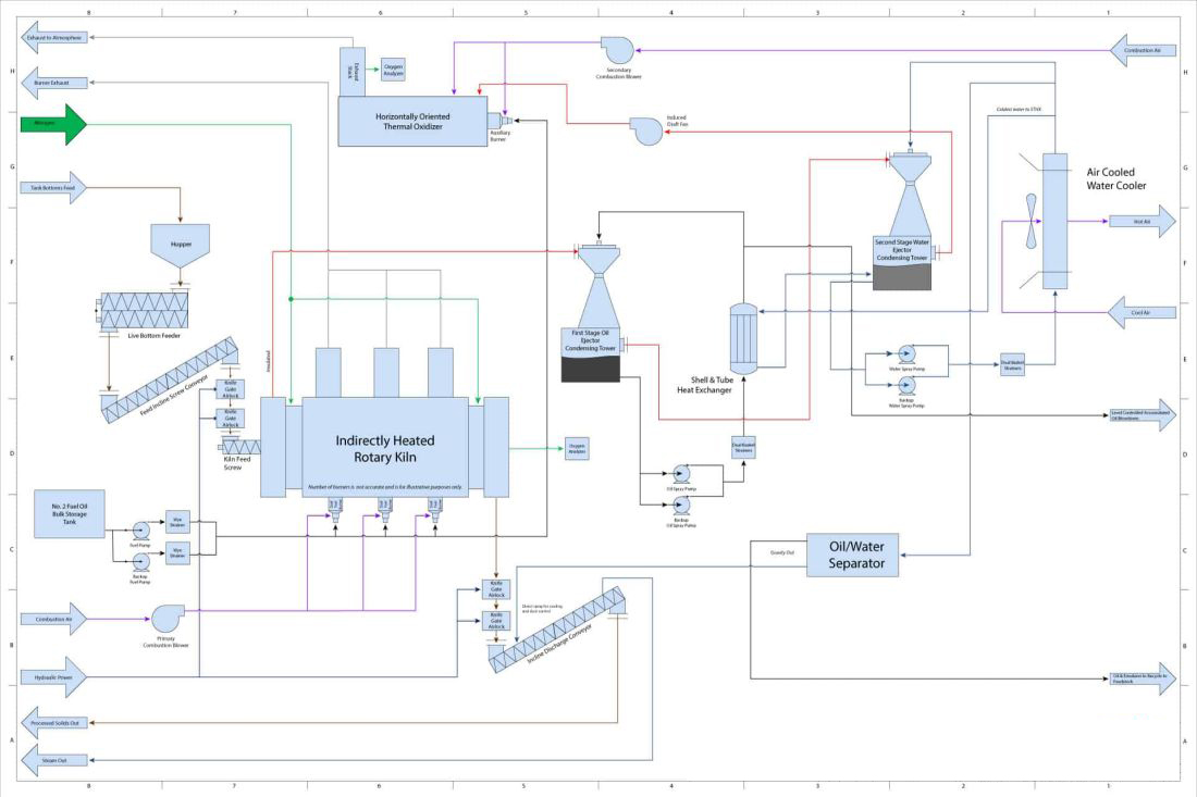 Stockpiled drilling muds are transferred to the 1 feed hopper mounted on the 2 live bottom feeder of the Primary Treatment Unit (PTU) by a backhoe or skid loader. From the live bottom feeder, material travels via the 3 transfer auger to the system’s 4 airlock, then through the 5 feed auger and into the PTU. The entire operation is managed from the 6 HMI control panel that houses the programmable logic control, starters, and variable frequency drives for operating and monitoring the plant from a single console. Two control panels are mounted outside right next to the equipment. The 7 combustion box contains the three heat zones and the indirect fired, 304 stainless steel PTU. The operating temperature of the drum is up to 950°F (510°C). The rotary kiln is housed in a combustion box with zone heating 8 burners transferring heat to the rotary kiln. The kiln operates in an oxygen-deficient and slightly negative atmosphere. Vapors from the contaminated soil are pulled out of the system in the opposite direction of the material flow. The vapor from the PTU is pulled into the high-efficiency 9 first stage venturi scrubber and inertial separator that uses oil as the condensing liquid, which is stored and redistributed in the 10 scrubber oil tank. The scrubber operates at 250°F (121°C) and removes dust particulate, as well as condensing the heavier hydrocarbons in the vapor stream. The vapor not condensed in the first stage condenser is pulled through the 11 second stage venturi scrubber and inertial separator that uses water as the condensing liquid, which is stored and redistributed in the 12 scrubber water tank. The scrubber operates at 175°F (79°C) and removes dust particulate, as well as condensing water and the lighter hydrocarbons in the vapor stream. An 13 induced draft fan pulls the non-condensable gases from the condensers and are pushed into the 14 Secondary Treatment Unit, also known as the thermal oxidizer, by where all remaining hydrocarbons are destroyed at temperatures of up to 2,000°F (1,093°C) with a residence time of up to two seconds. Fluid from the water condenser (the condensed water, oil, and sludge) is pumped through an oil/water 15 separator before being transferred to on-site storage tanks. The processed solids exit through the discharge system which consists of a 16 airlock and a 17 hydrating screw conveyor to cool the solids.